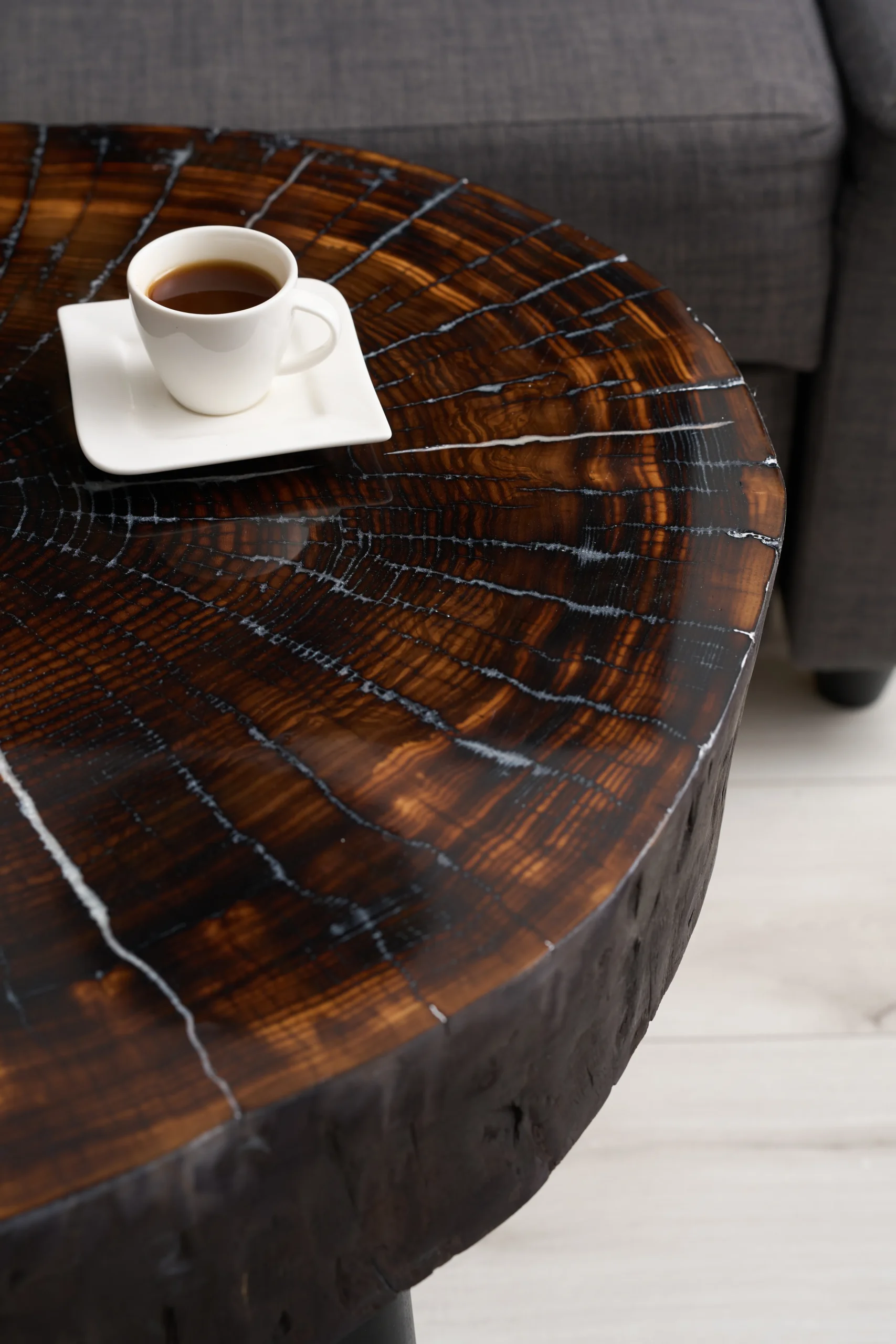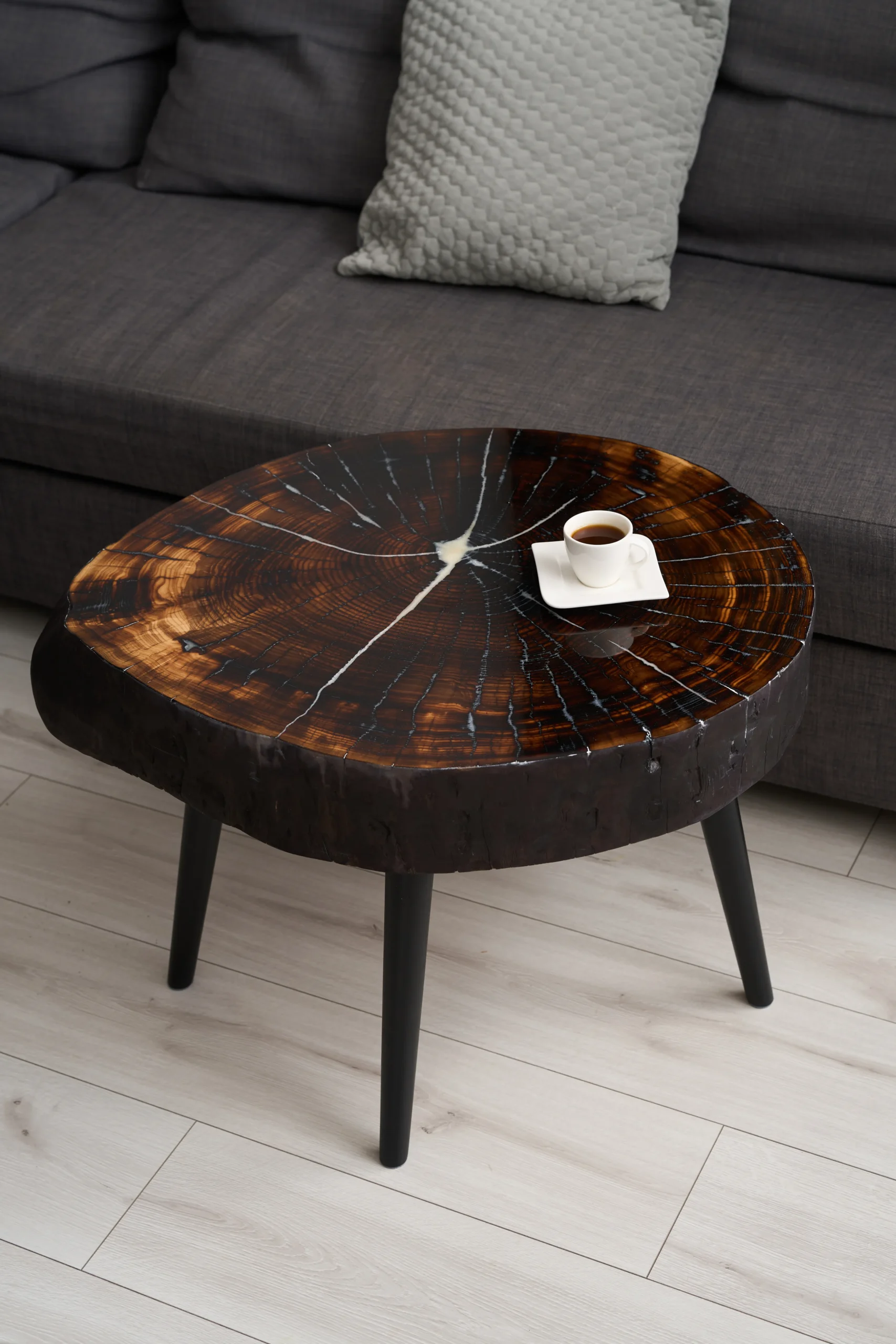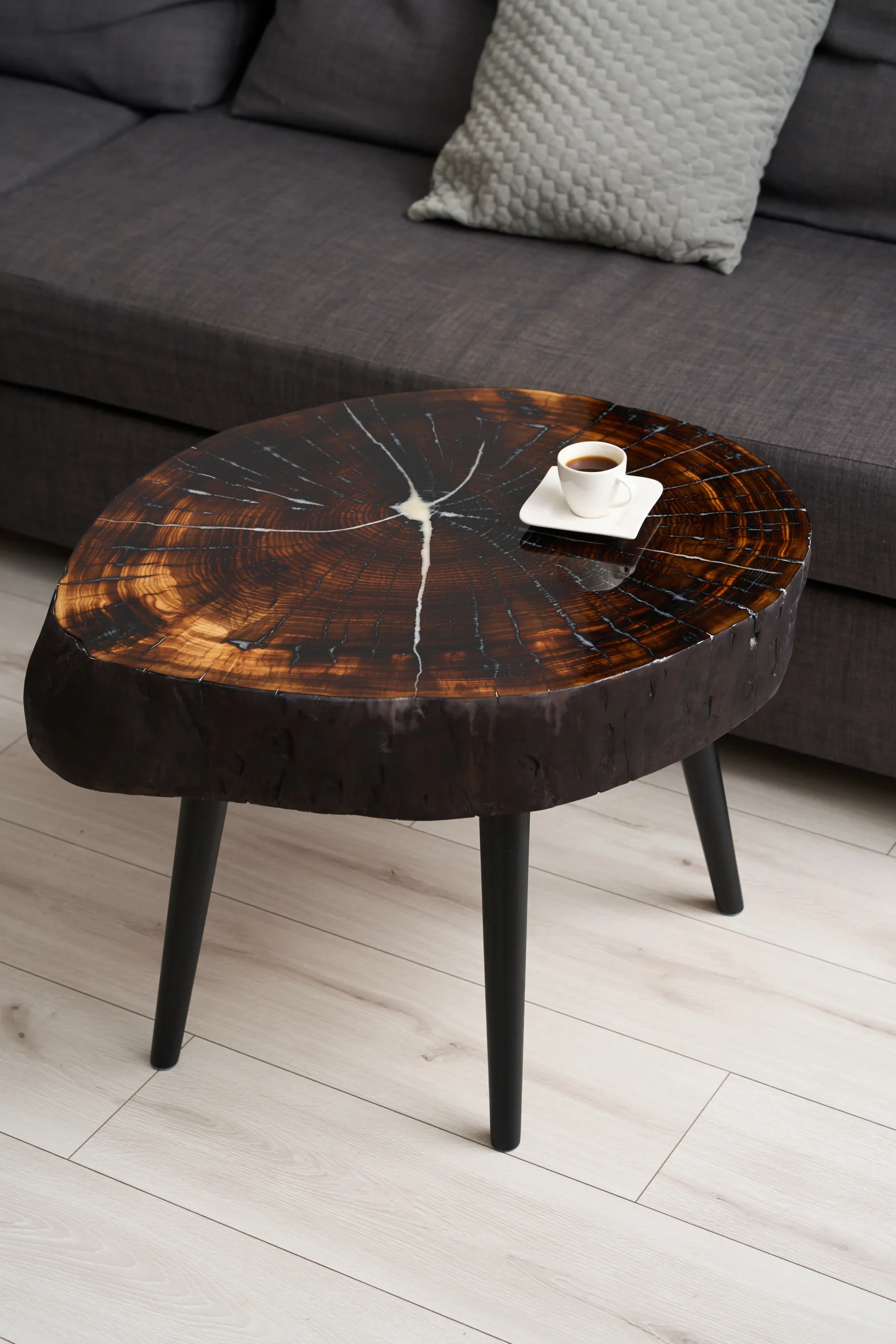 Blat powstaje z grubego plastra debu. Naturalne ubytki wypelniamy bialo perlow a zywica, dlatego powierzchnia zyskuje szlachetny polysku i glebie. Nieregularny ksztalt 66 do 56 cm podkresla unikatowy charakter mebla. Czarne drewniane nogi wysokosci 42 cm zapewniaja stabilnosc, a lakier akrylowy w polysku chroni blat i ulatwia pielegnacje.