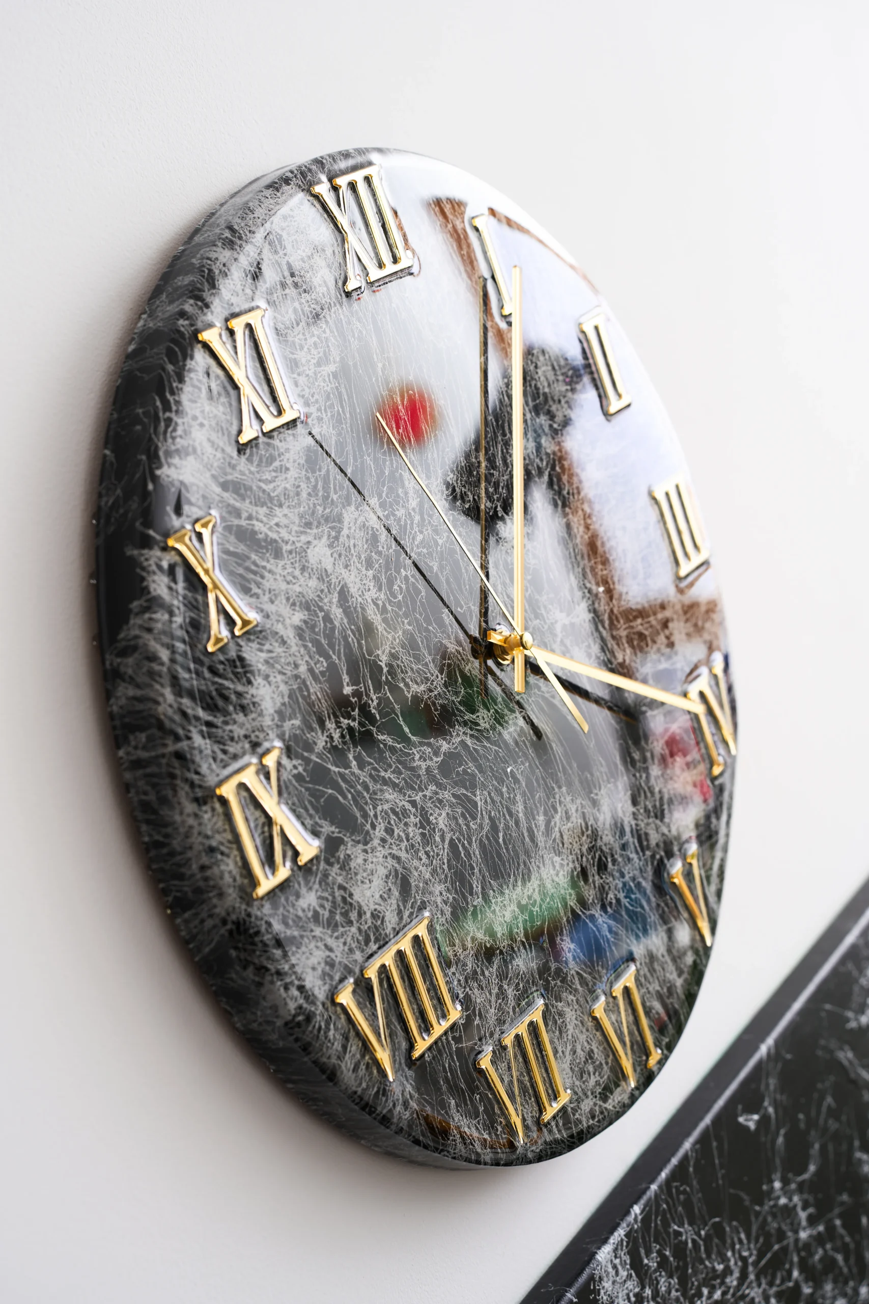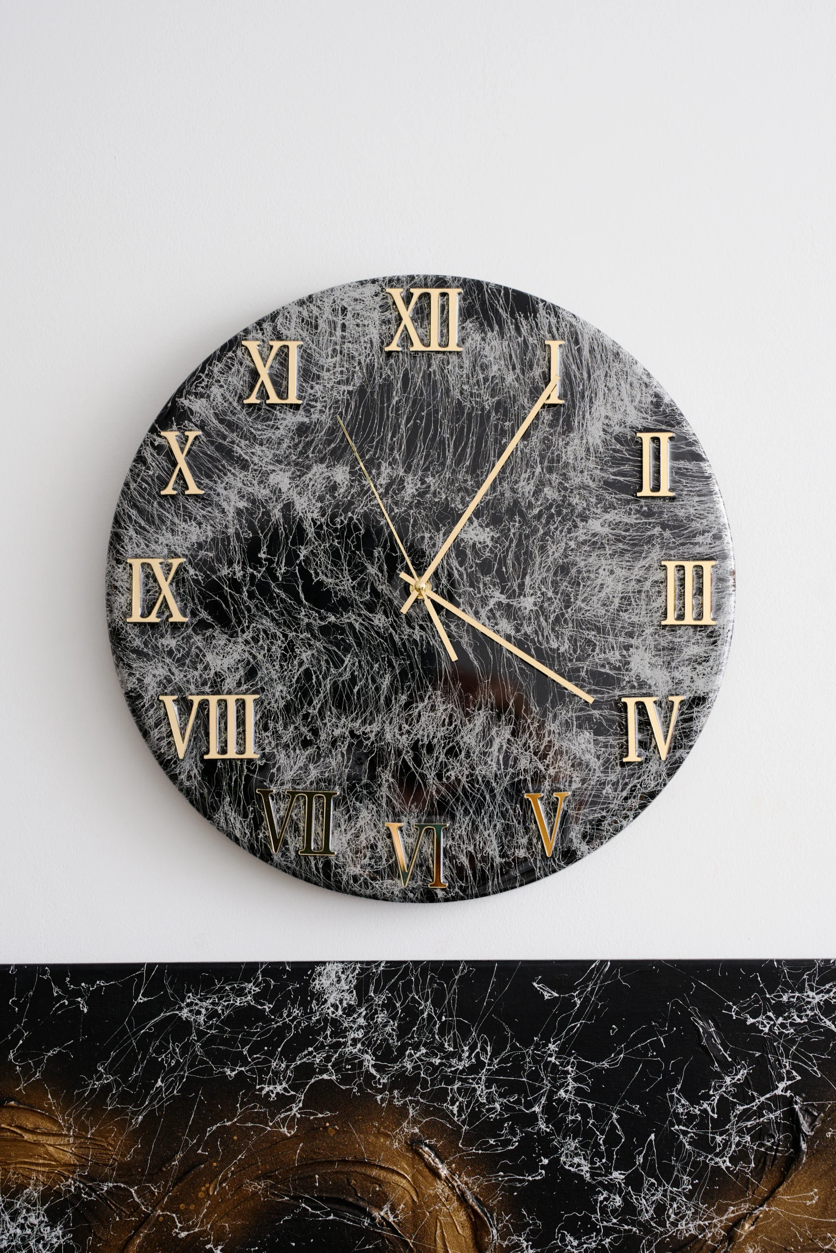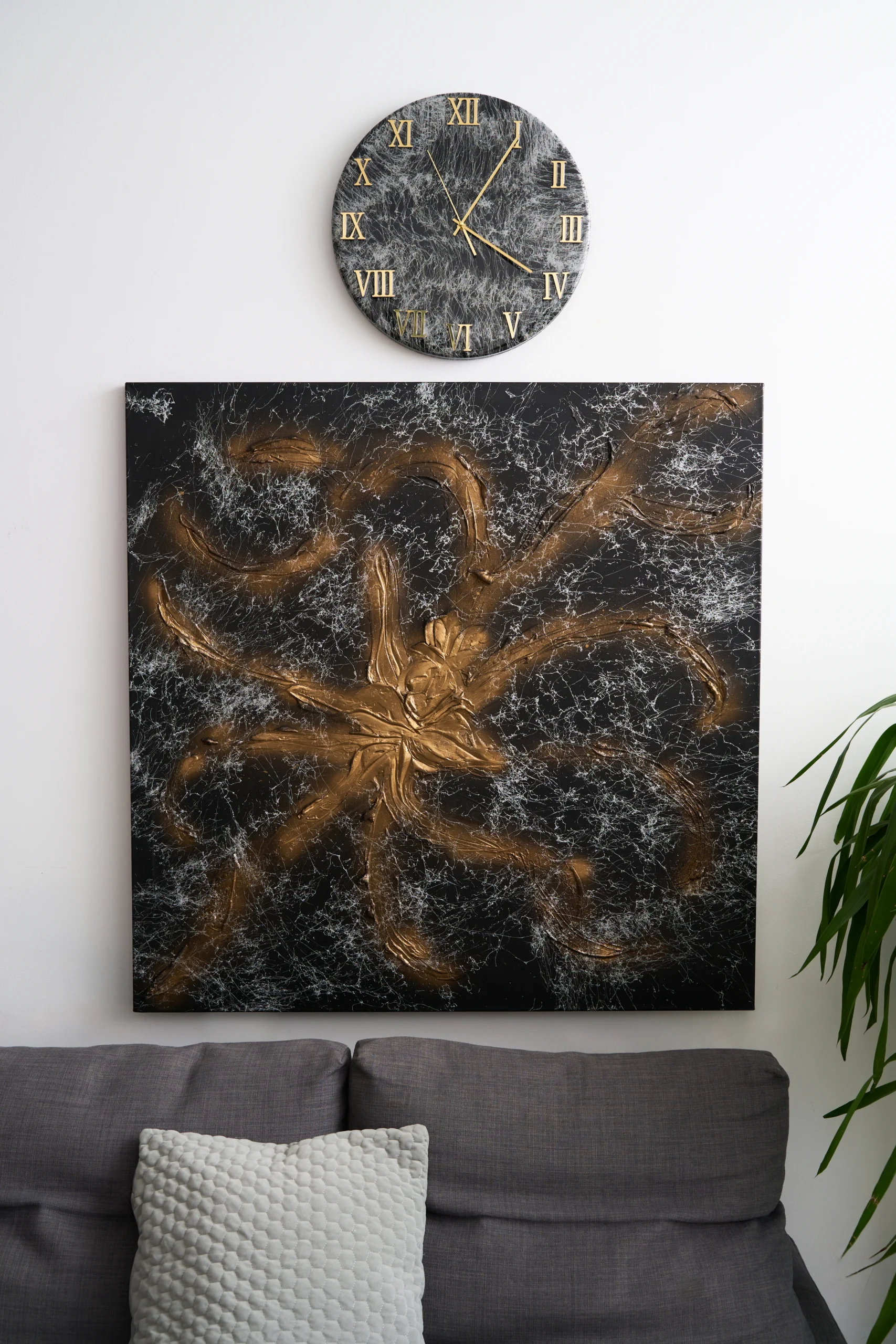Zegar wykonujemy z plyty mdf i czarnej zywicy z jasnym rysunkiem pajeczyny. Zlote wskazowki oraz rzymskie cyfry domykaja palete barw. Cichy mechanizm podnosi komfort, co wiecej prosta forma pozwala latwo zgrac zegar z obrazem i stolikiem.