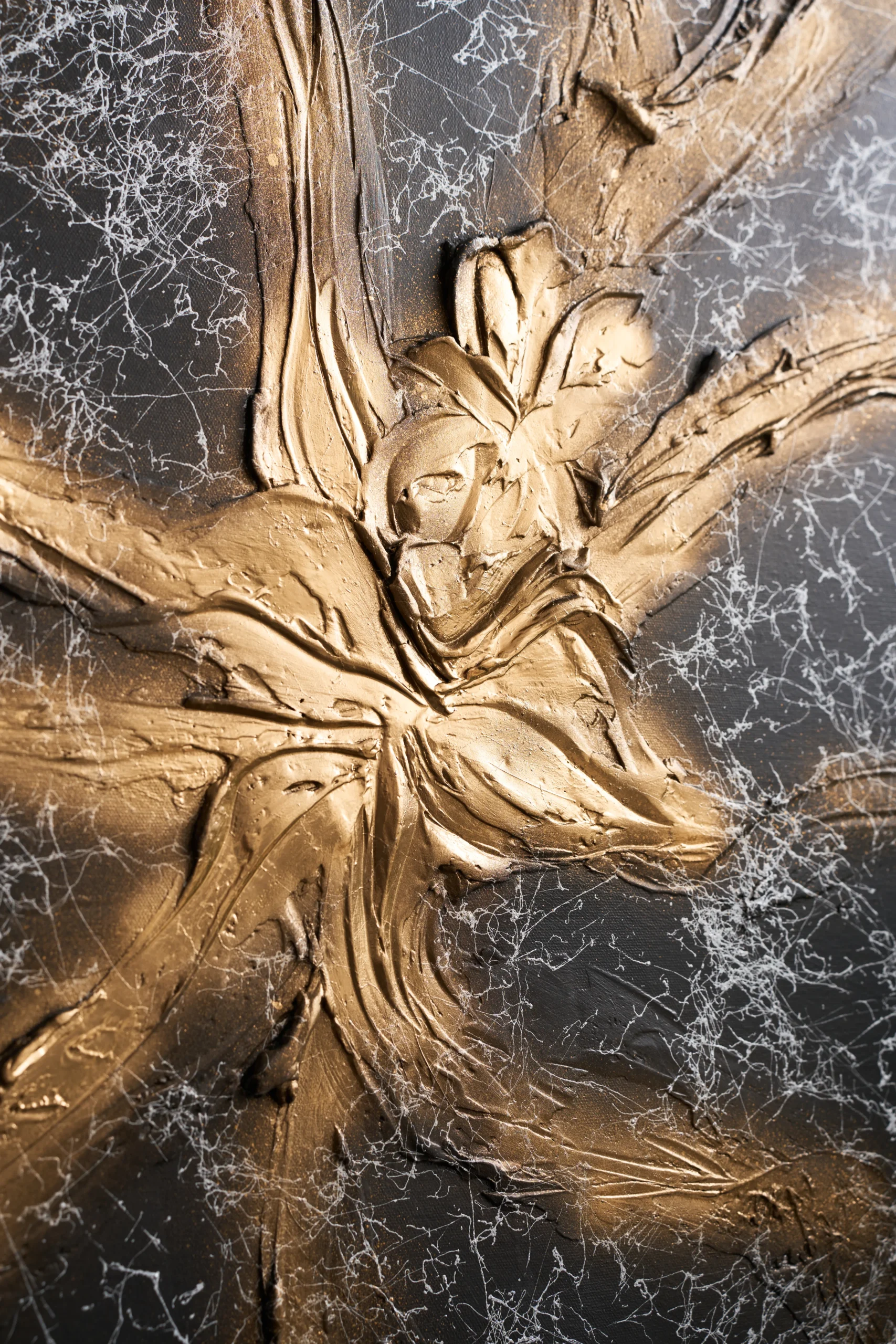 Strukturalny obraz w czarno zlotych tonach dziala jak centralny punkt sciany. Faktura wzmacnia trojwymiarowosc, dlatego swiatlo podkresla linie i przejscia kolorow. Taki akcent pasuje do stylu nowoczesnego i glamour, a takze ozywia proste minimalistyczne wnetrza.
