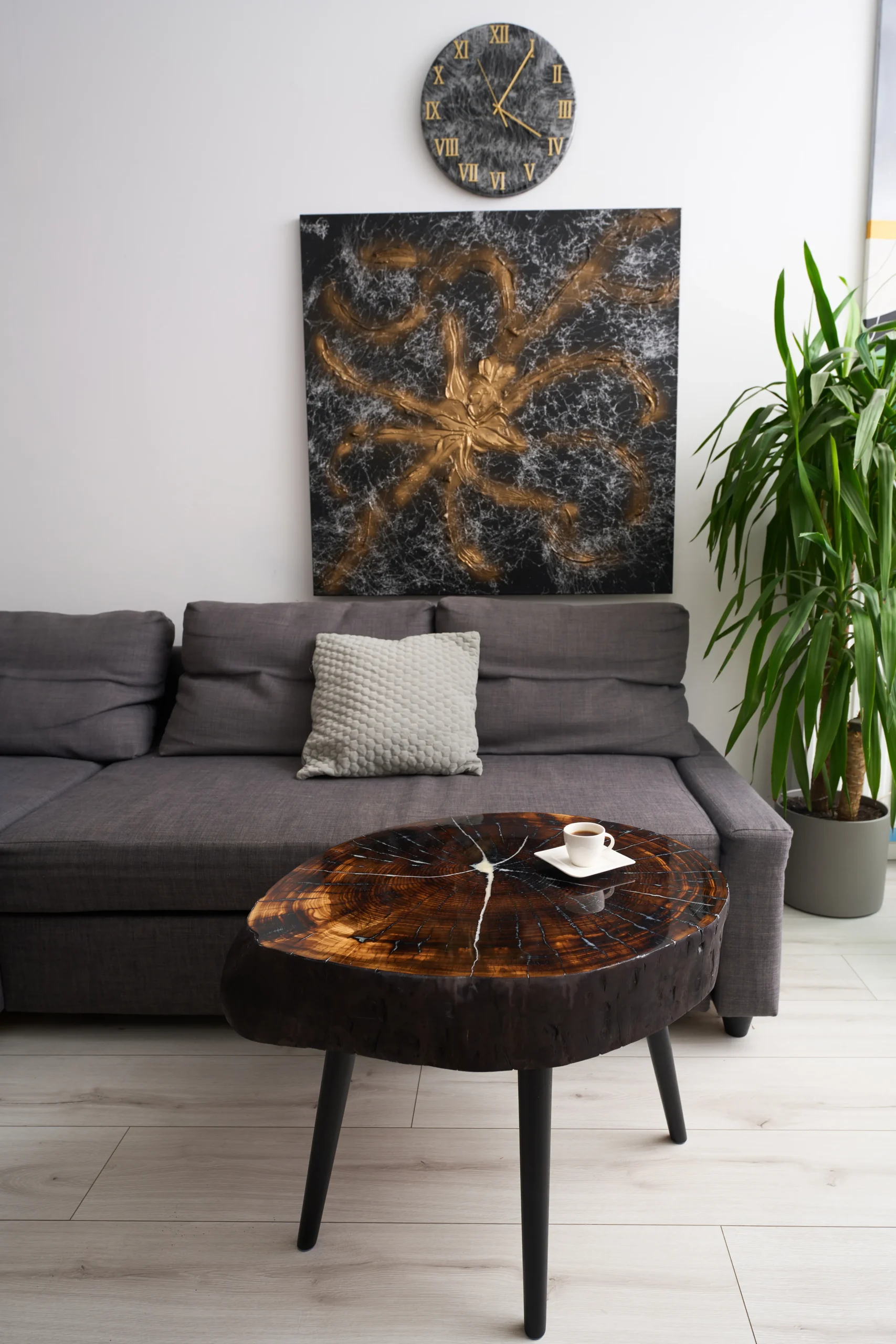 Czarno zloto srebrny zestaw dekoracyjny do salonu z zywicy i drewna mozesz kupic w komplecie lub oddzielnie. Na zyczenie dopasujemy udzial bieli i zlota, sposob opalania drewna oraz poziom polysku. Dzięki temu Pajakowa elegancja wpisze sie dokladnie w Twoj styl.
