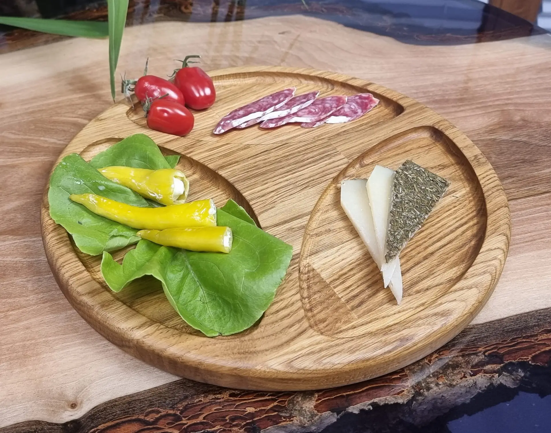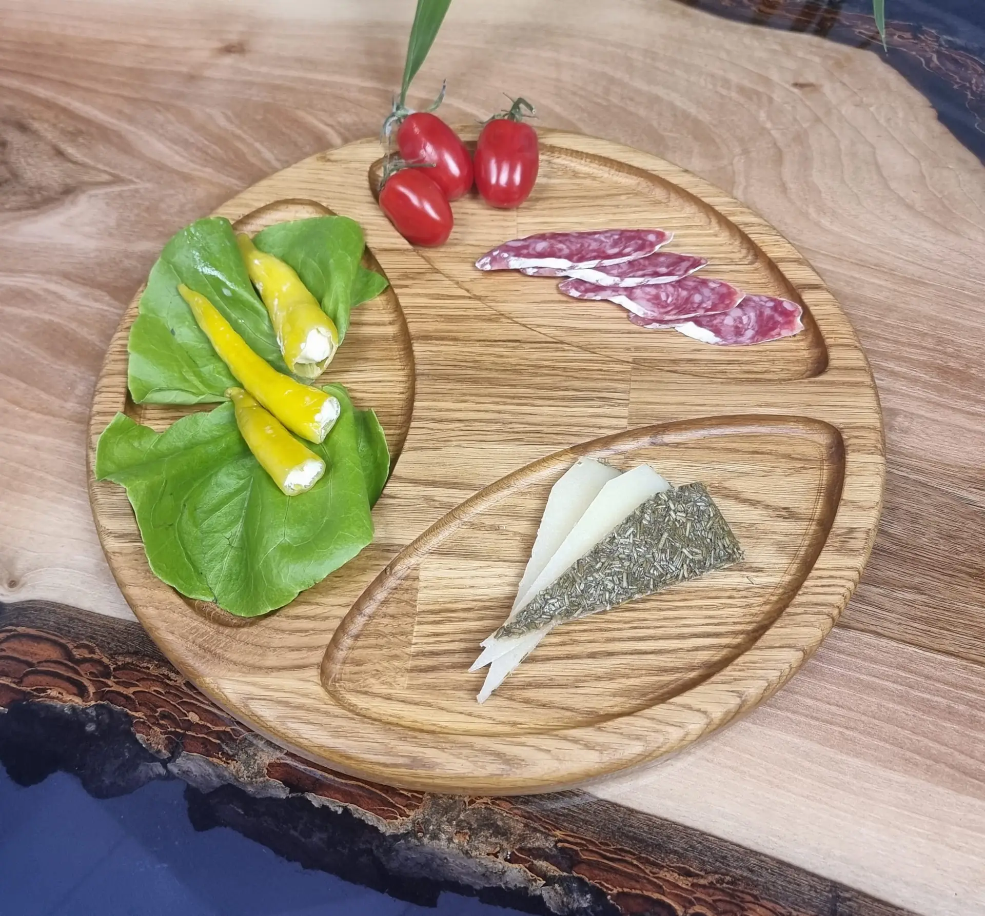 Deska została zaprojektowana z trzema przegródkami, które umożliwiają estetyczne oddzielenie różnych produktów. Możesz serwować na niej sery, wędliny, owoce, orzechy lub warzywa – bez ryzyka, że będą się ze sobą mieszać. Takie rozwiązanie pozwala podawać przekąski w sposób uporządkowany, a jednocześnie efektowny.