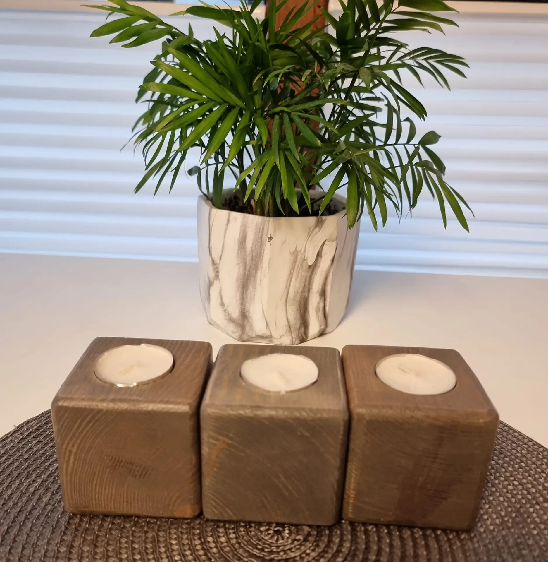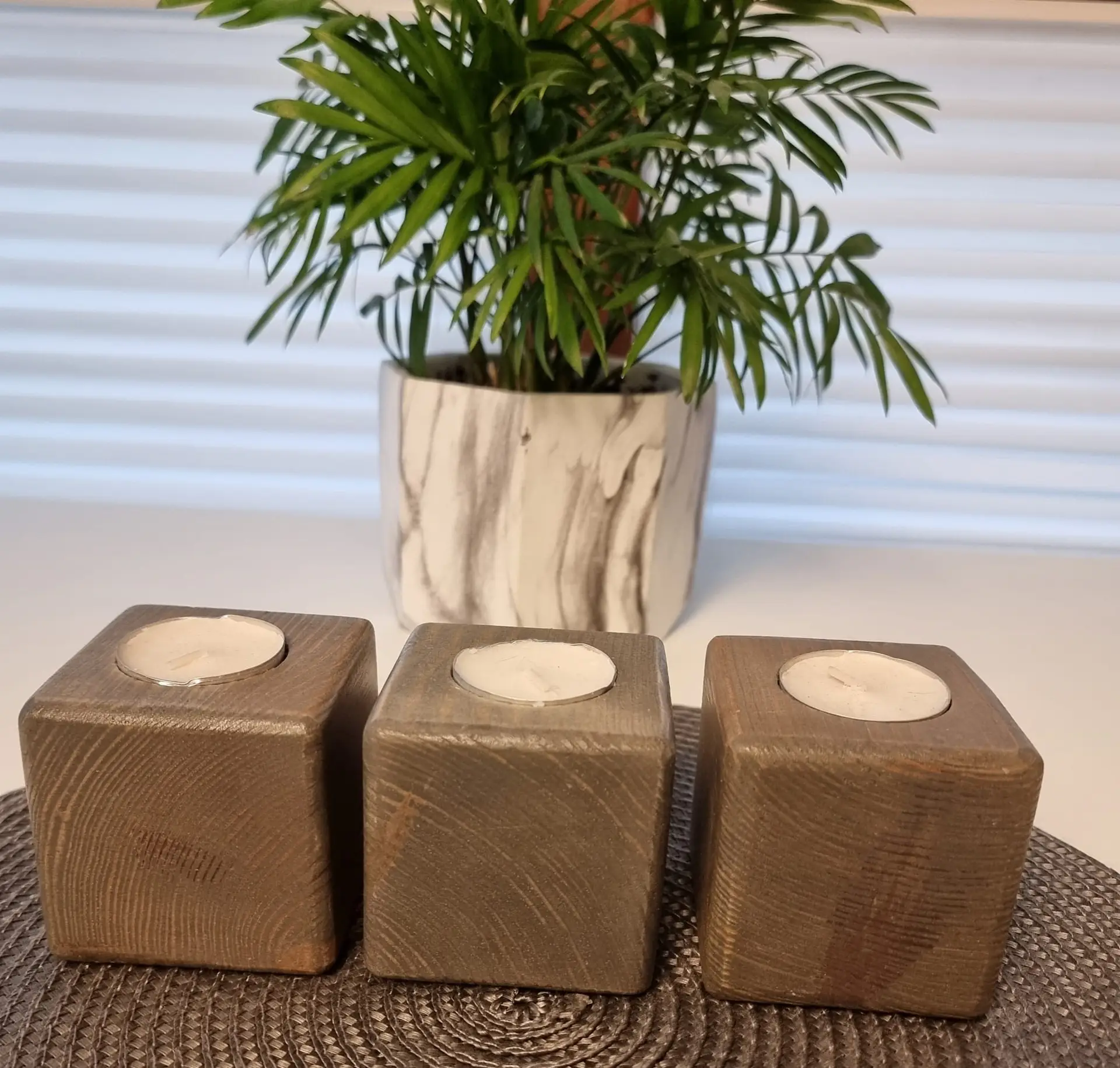 Kwadratowe świeczniki dębowe szare to elegancki komplet, który łączy naturalne piękno drewna z subtelnym odcieniem szarości. Każdy świecznik ma bok o długości około 6 cm, dlatego doskonale sprawdza się jako minimalistyczna, ale jednocześnie wyrazista dekoracja. Dzięki prostemu designowi i stonowanej kolorystyce zestaw pasuje zarówno do nowoczesnych, jak i klasycznych aranżacji.