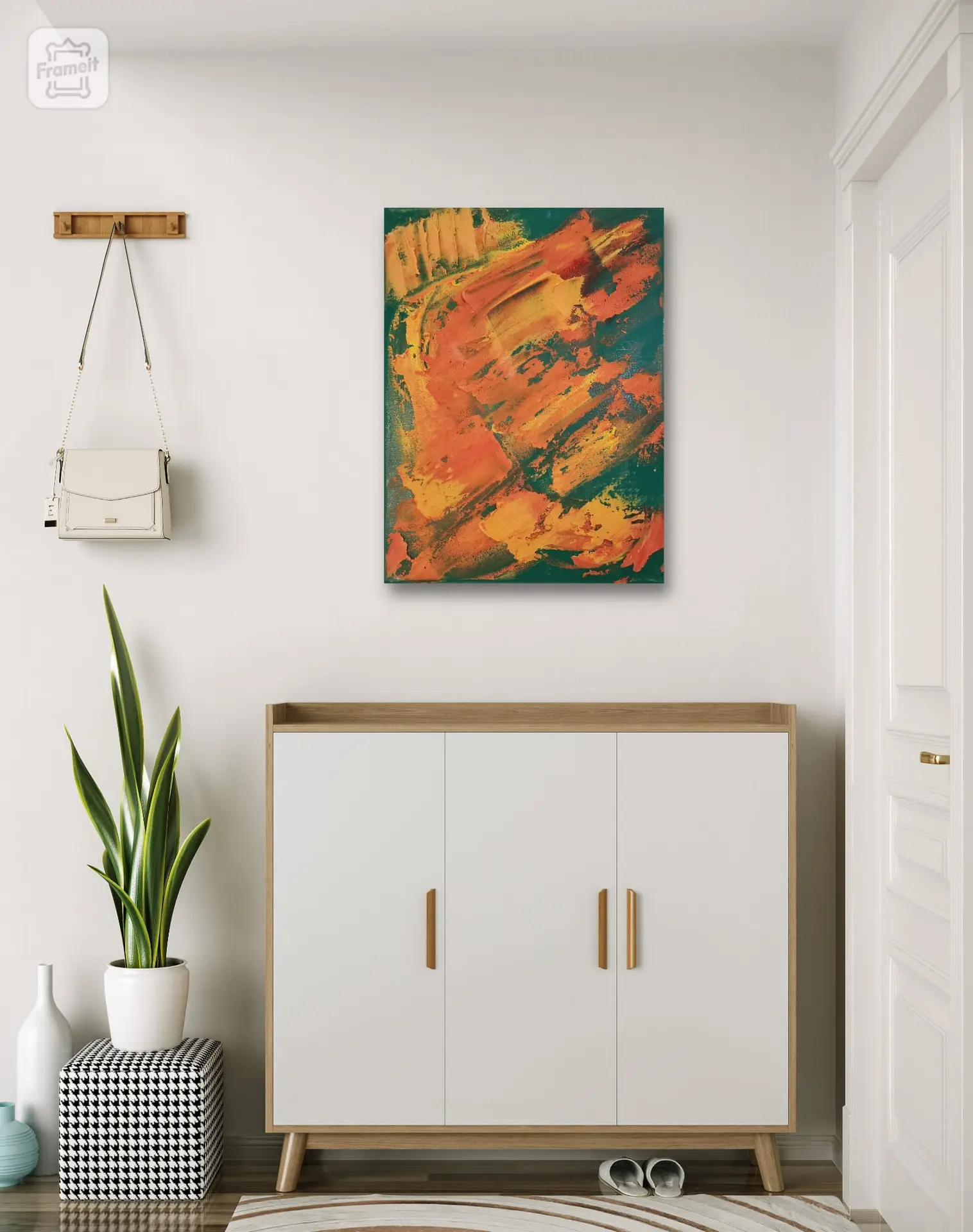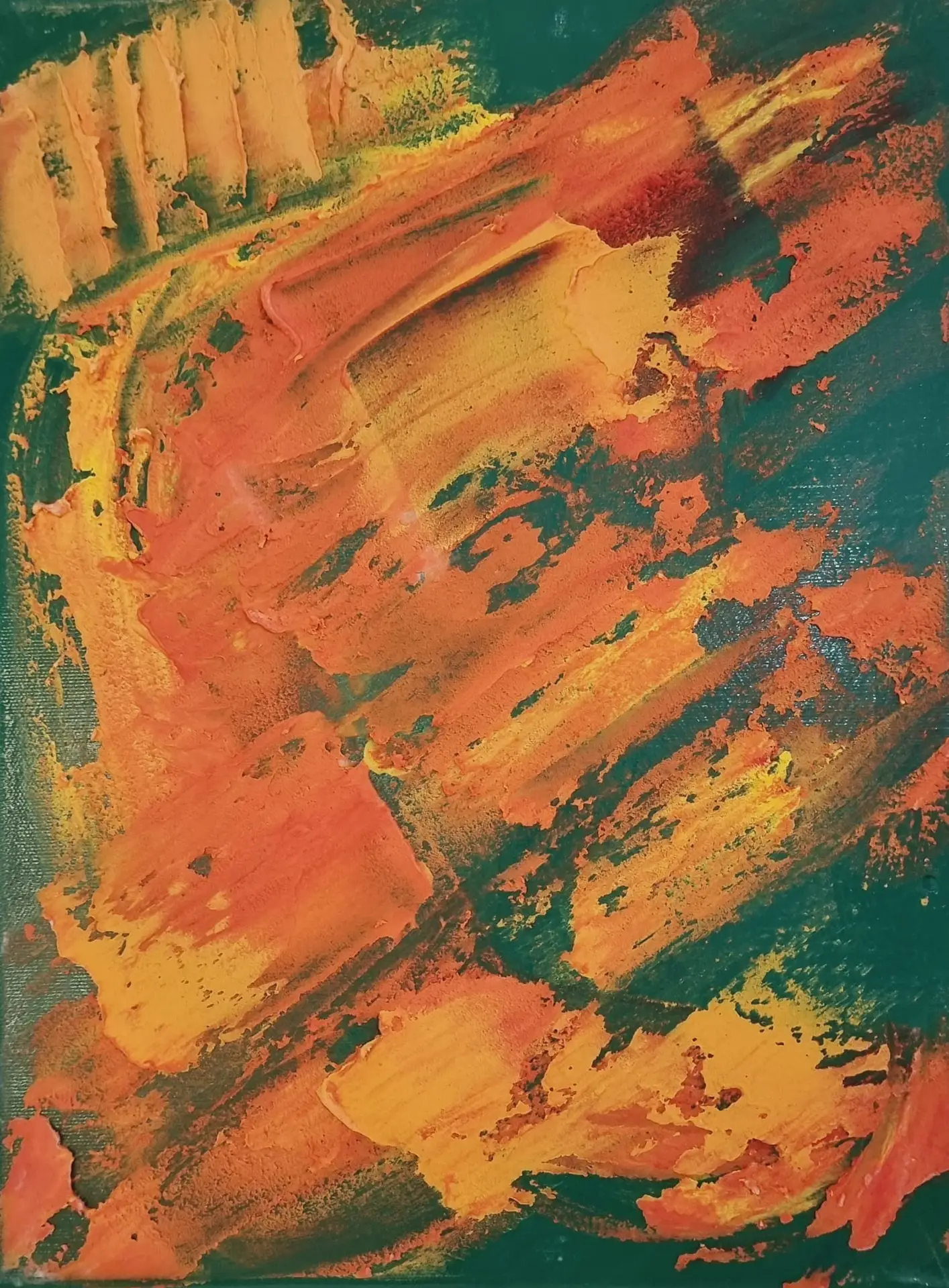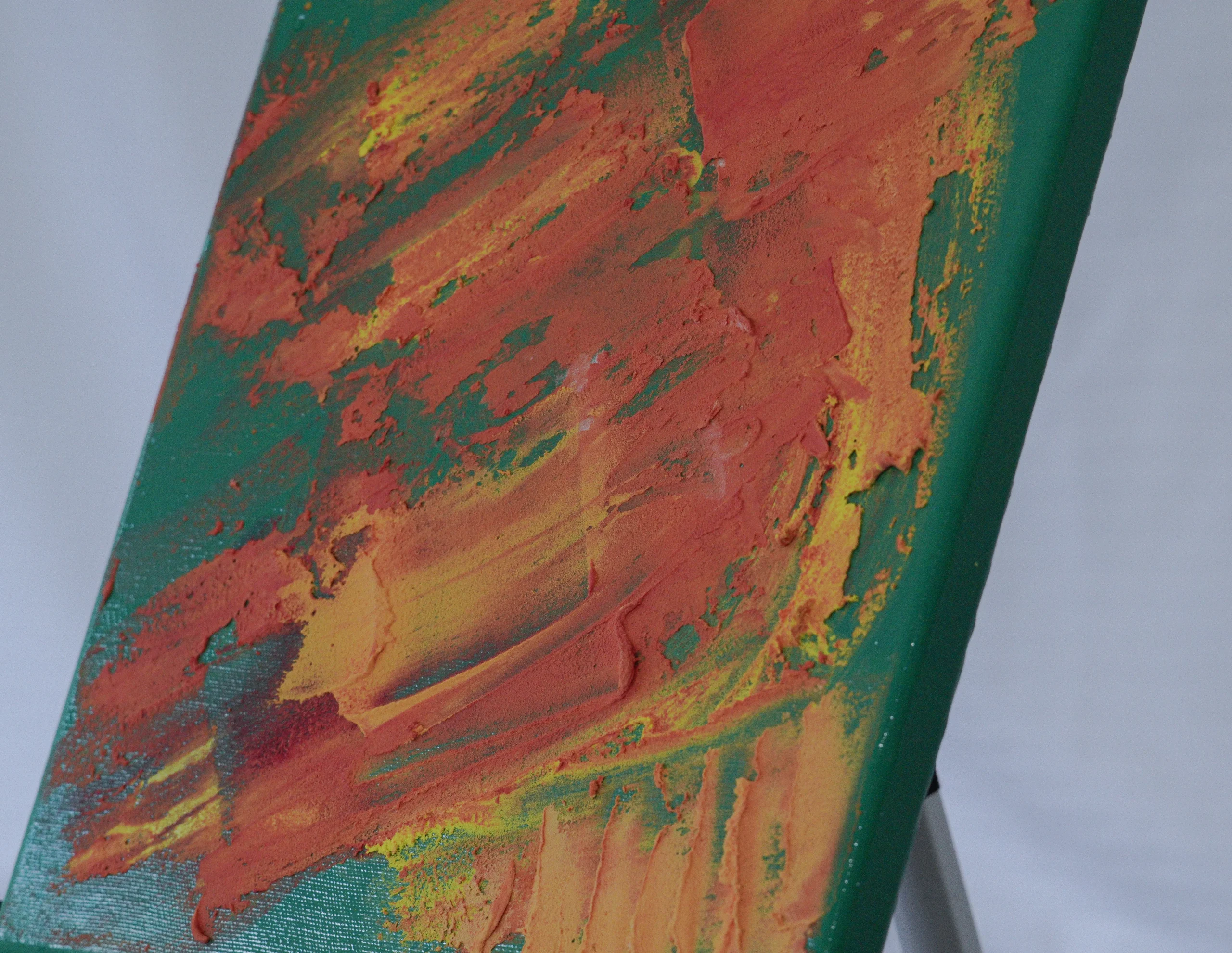 Obraz abstrakcyjny w jesiennych kolorach łączy soczystą zieleń tła z ciepłymi akcentami żółci i pomarańczu w formie pasty strukturalnej. Dzięki kontrastom oraz wyczuwalnej fakturze kompozycja emanuje energią, a jednocześnie zachowuje harmonię barw inspirowanych naturą.