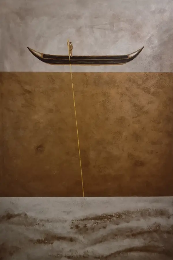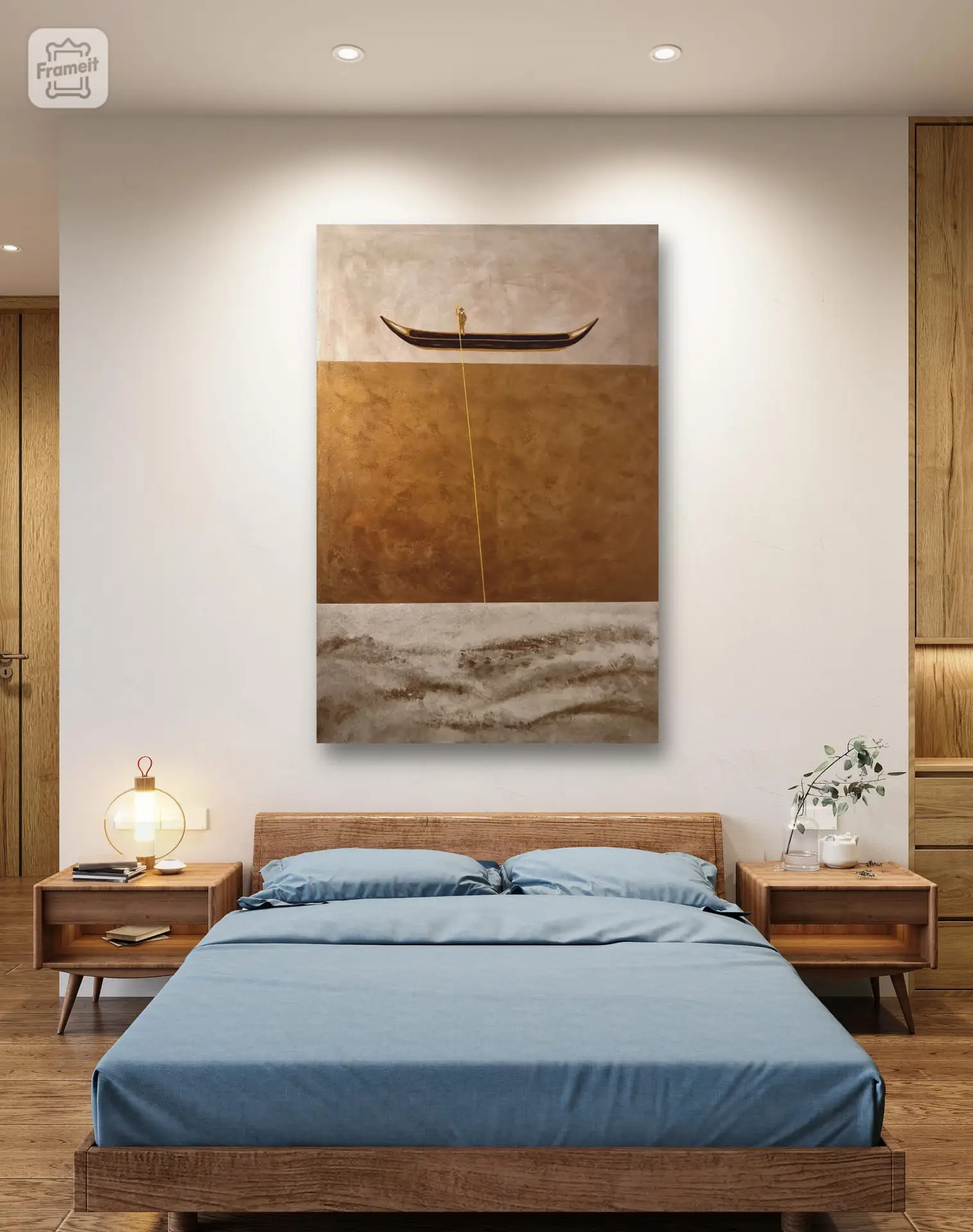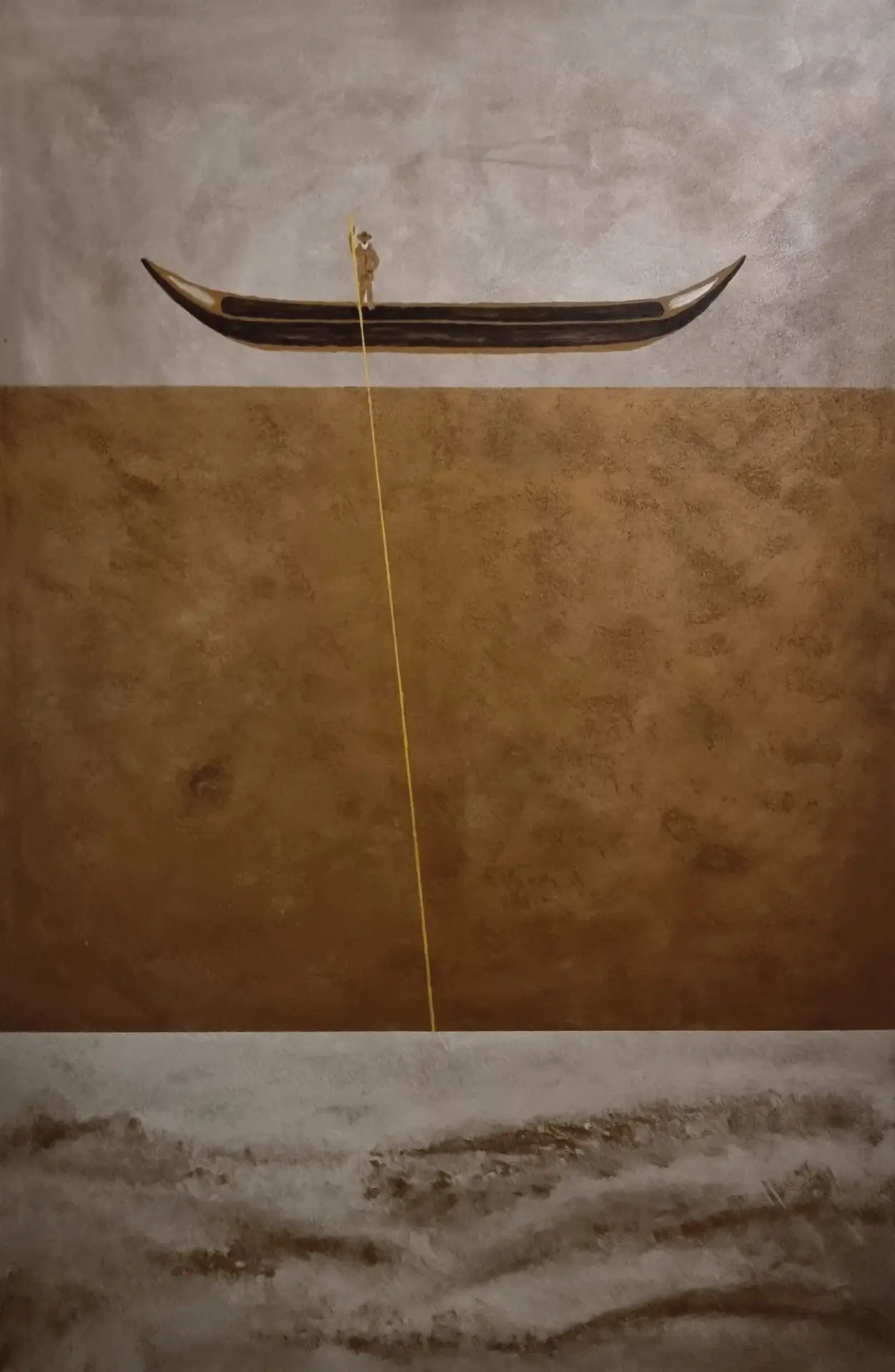 Łódź, unosząca się na spokojnej tafli, symbolizuje podróż i kontemplację.